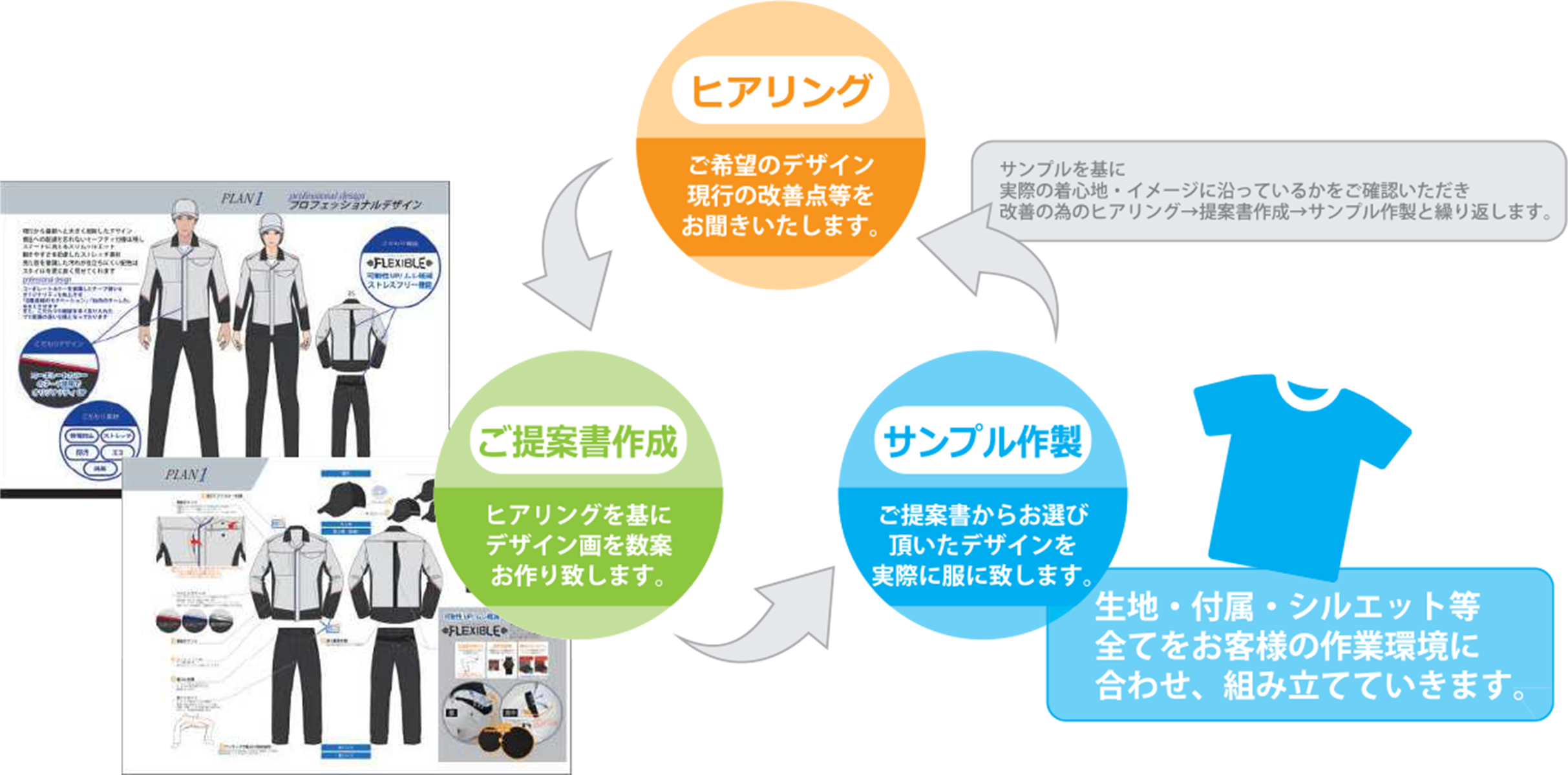 デザイン・機能性・着心地など、お客様の理想をカタチにする提案力が強みです。素材選びから細部の仕様まで最適なプランをご提案し、理想以上のユニフォームを実現します。