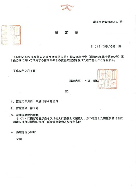 2004年4月23日に環境省の産業廃棄物広域認定制度で第1号認定を取得し、使用済み繊維製品の効率的なリサイクルを推進しています。